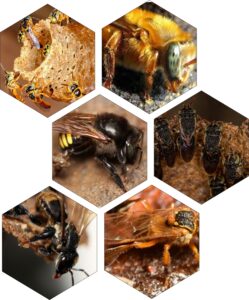 Sociedade altamente cooperativa. As meliponíneas são eusociais: vivem em colônias perenes com rainha (reprodução), operárias (defesa, coleta, criação das crias, construção) e zangões (machos reprodutores). A divisão de trabalho muda com a idade da operária — de “babá” a forrageadora. Seus ninhos têm potes de mel e pólen, discos de cria e envoltórios de cerume (mistura de cera + resinas). Muitas espécies usam geoprópolis (propolis + partículas minerais) e batume (massa de vedação) para controlar temperatura e umidade. Na defesa, não ferroam, mas mordem, lançam resinas pegajosas e fazem “voos de intimidação”. Embrapa+1